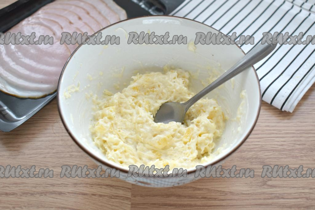 В центр каждого ломтика ветчины помещаем примерно 2 чайных ложки начинки из сыра и ананаса.