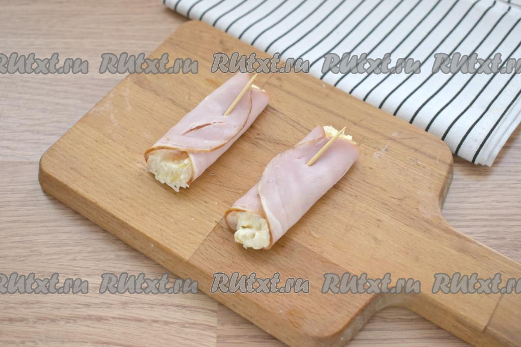 Накрываем начинку сначала одной стороной ломтика ветчины, затем сверху - второй. Фиксируем рулетик либо шпажкой, либо зубочисткой. Аналогично формируем остальные рулетики. Перекладываем их на блюдо и подаём к столу.