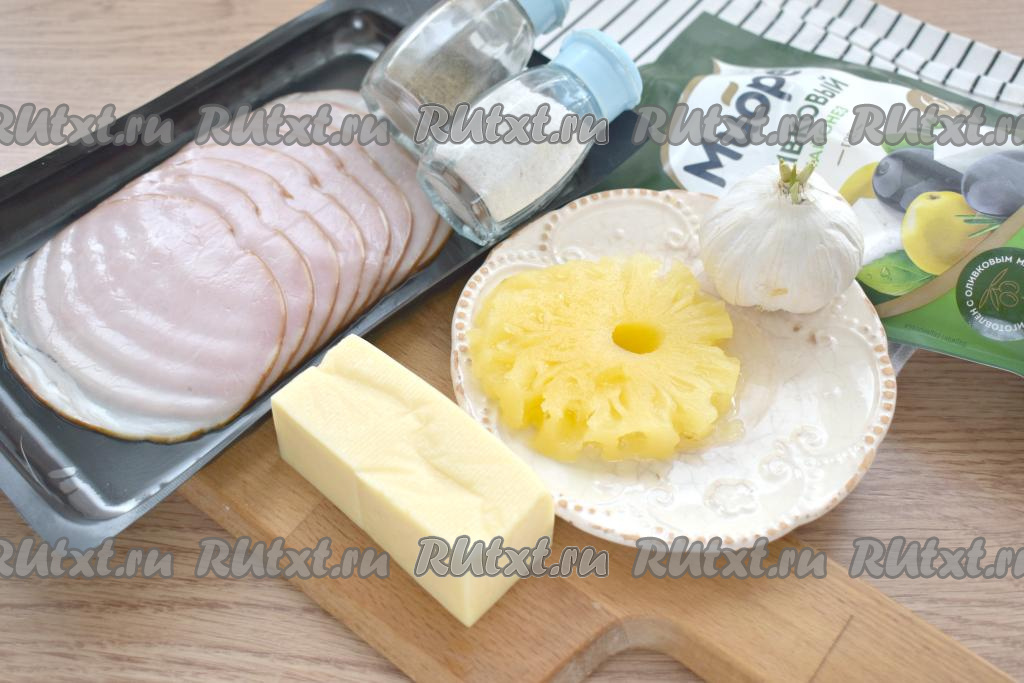 Для приготовления закуски нам потребуются вот такие ингредиенты. Ветчину лучше взять сразу в нарезке, ведь она тонкая, эластичная и не сломается при формировании рулетиков.