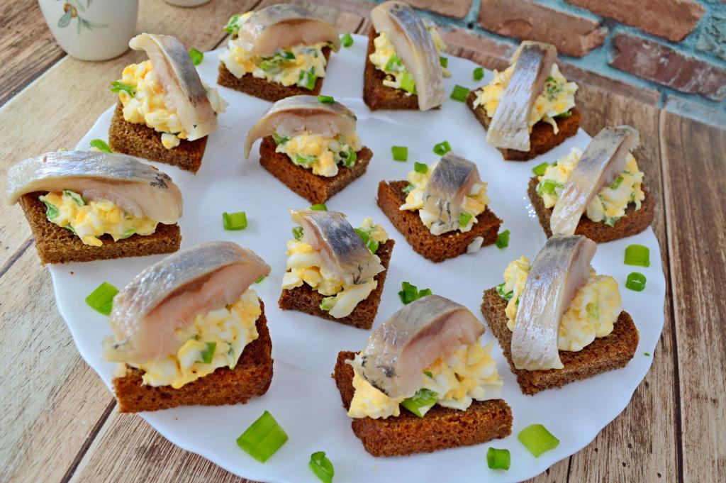 Порционные закуски отлично смотрятся на праздничном застолье. В этот раз предлагаю приготовить небольшие бутерброды с яйцом и селёдкой на чёрном хлебе. Это бутербродики, как говорится, на один укус. Мне очень нравятся такие бутерброды: готовятся они просто, из доступных продуктов, а получаются эффектными и вкусными. Такая закуска неизменно пользуется популярностью на праздничном застолье. Всем советую приготовить эти аппетитные бутерброды!