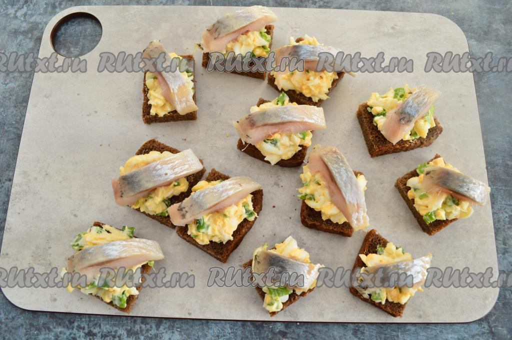 Нарезать филе сельди на кусочки шириной 1-1,5 сантиметра. Выложить по кусочку селёдки на каждый бутерброд поверх яично-лукового салата.