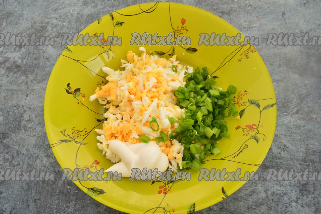 Перья зелёного лука вымыть, стряхнуть с них лишнюю жидкость, а затем мелко нарезать и добавить в тарелку с яйцами. Сюда же выложить майонез, перемешать яично-луковый салат, немного подсолить (сильно солить не нужно, ведь в дальнейшем будет выкладываться селёдка).
