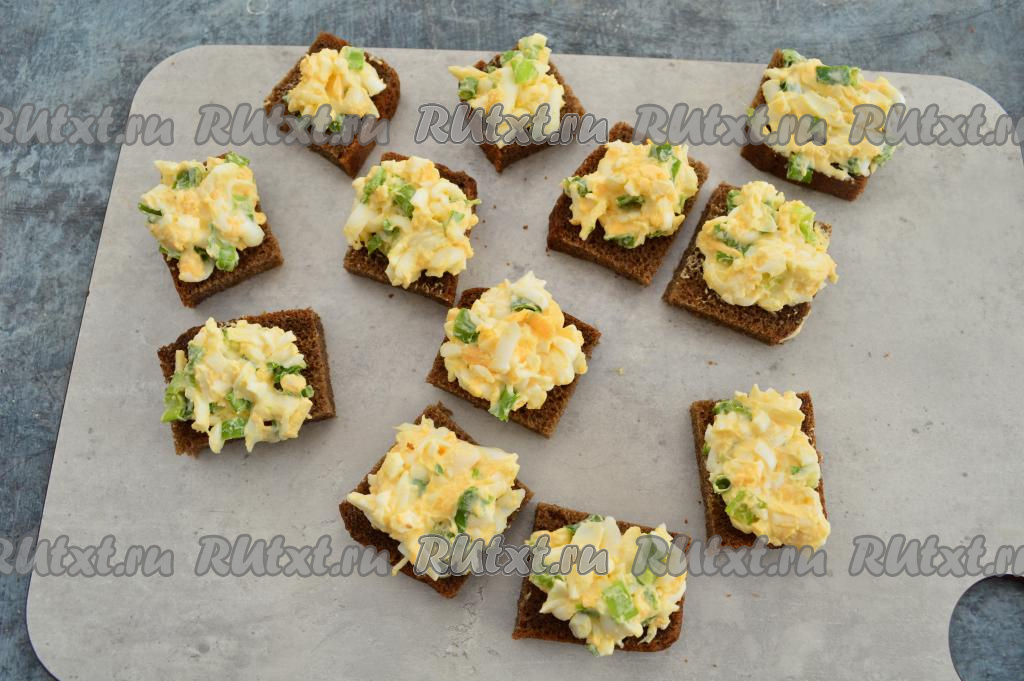 На квадратики чёрного хлеба разложить яично-луковый салат. Всего получается 12 небольших бутербродов.