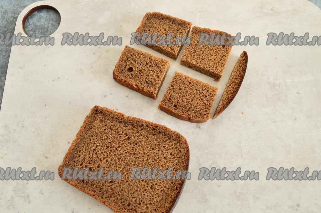 У хлеба отрезать верхнюю чёрную корочку. Разрезать каждый кусочек хлеба на 4 квадратика.