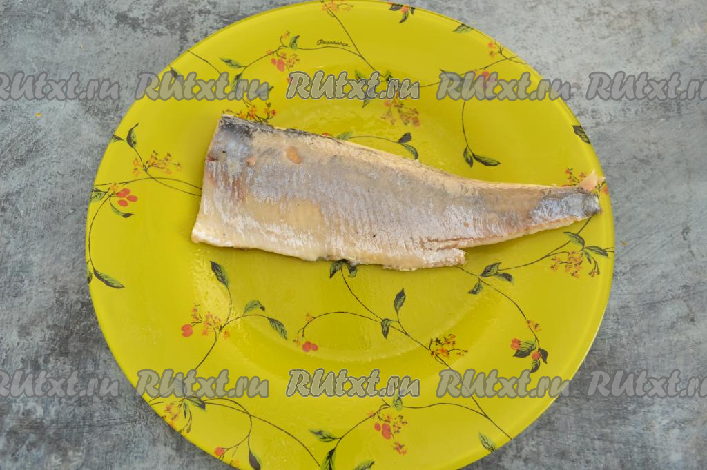 Я взяла половину филе селёдки, засоленной в домашних условиях, сняла с сельди кожу и тщательно убрала все косточки. Можно взять и покупное филе сельди, уже нарезанное на порционные кусочки.