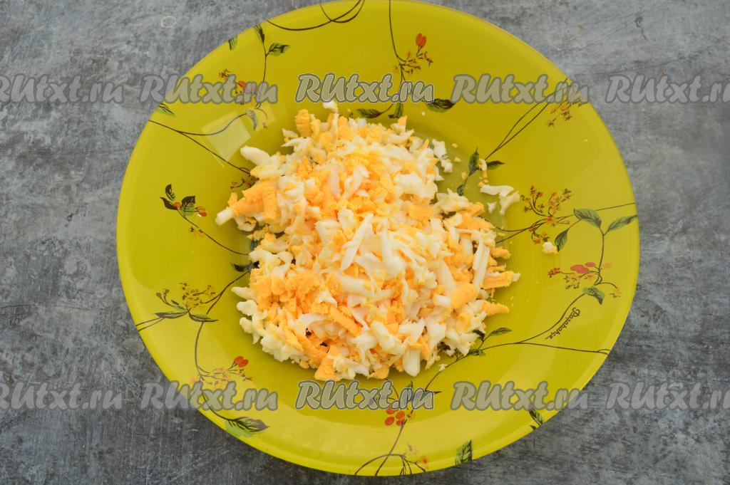 Отварить яйца в течение 10 минут после закипания воды, а затем дать им остыть, очистить и натереть на крупной тёрке в глубокую тарелку.