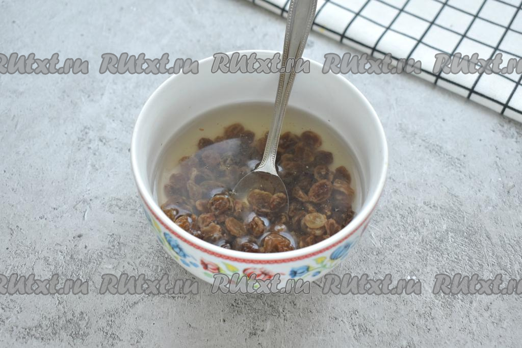 Изюм перекладываем в небольшую ёмкость, полностью заливаем кипящей водой и оставляем на 5-10 минут, затем откидываем на сито, промываем, сливаем лишнюю воду. Выкладываем изюм обсушиться на тканевое (или бумажное) полотенце.