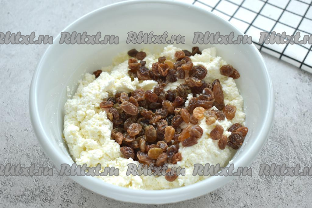 В получившуюся однородную творожную массу добавляем подготовленный изюм и перемешиваем.