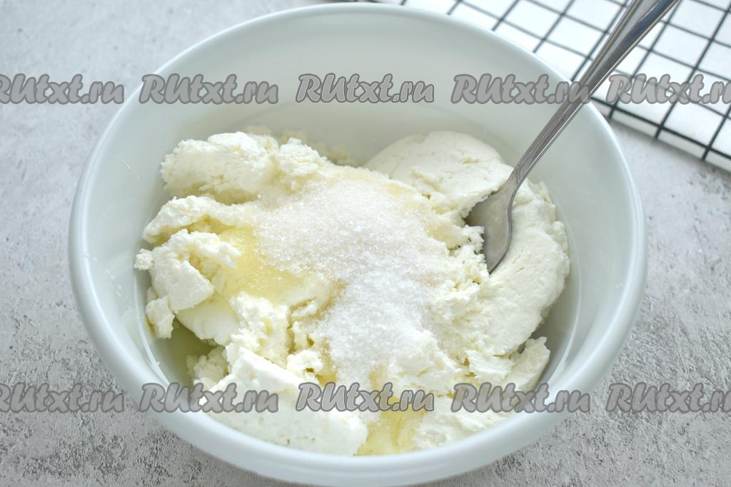 Творог перекладываем в миску, добавляем к нему сахар обычный и ванильный, всыпаем щепотку соли. Яйцо разделяем на белок и желток. Белок отправляем к творогу. Желток нам потребуется позже для смазывания пирога. Творог перетираем с сахаром и куриным белком вилкой.