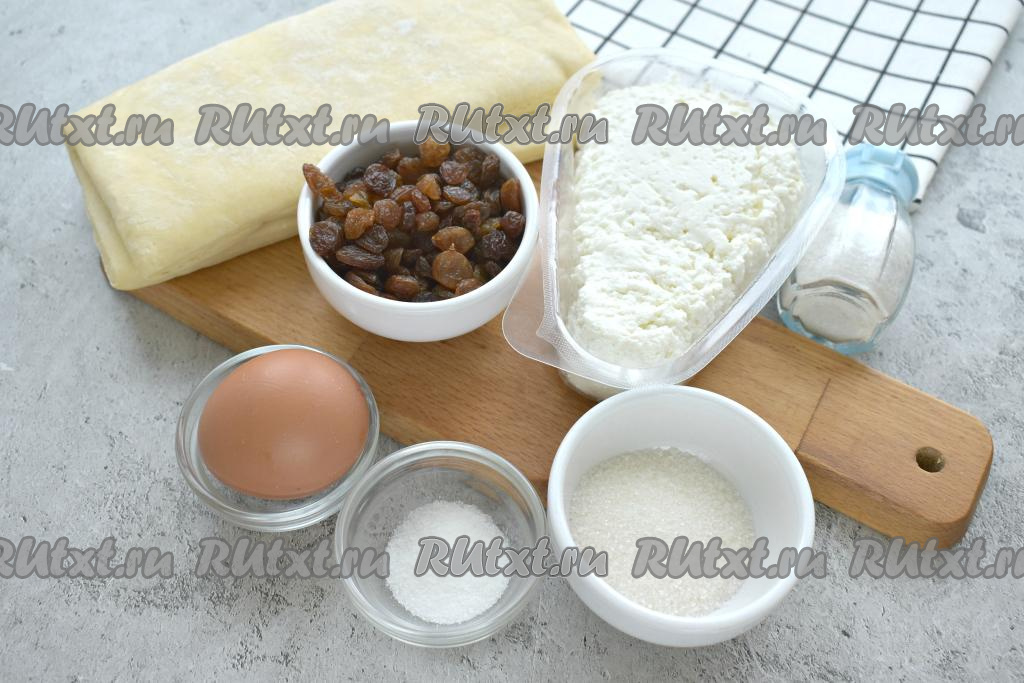 Подготовим продукты для нашего пирога с творогом. Слоёное дрожжевое тесто заранее достаём из морозилки и оставляем его размораживаться при комнатной температуре. Изюм перебираем, удаляем лишний мусор и хвостики.