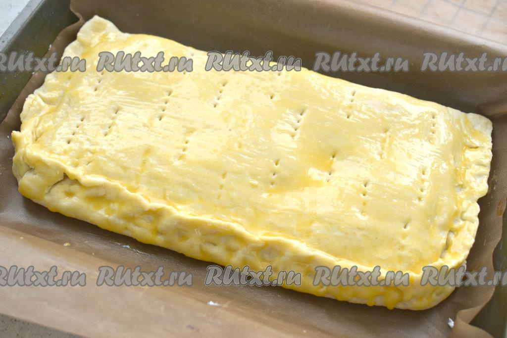 Накрываем начинку свободной стороной теста, скрепляем края, на поверхности пирога делаем проколы вилкой. Желток перемешиваем и смазываем им пирог.