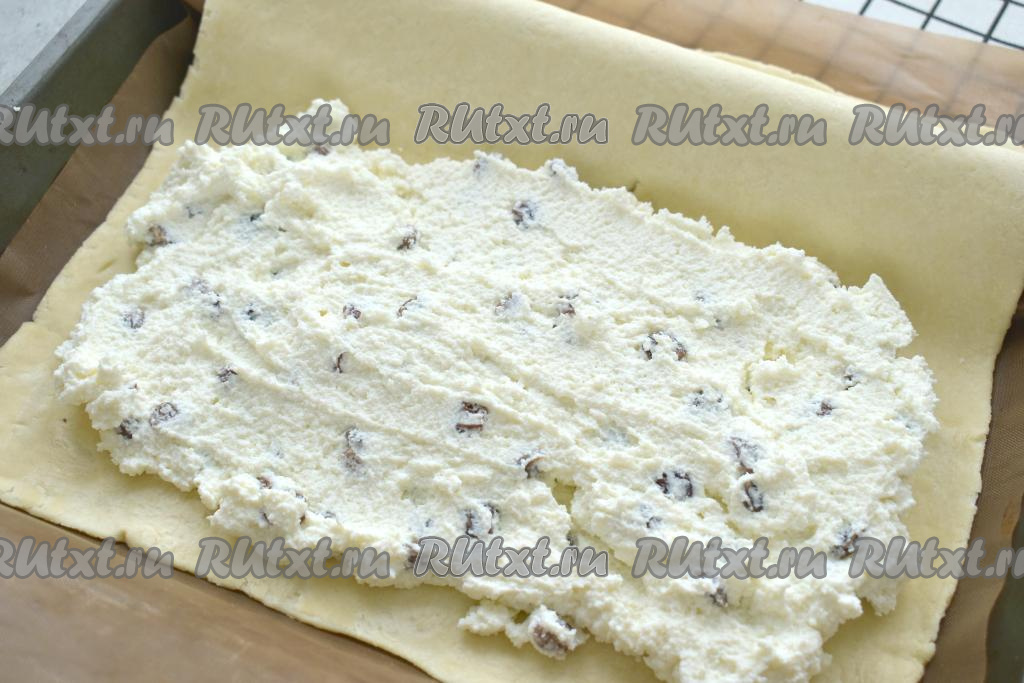 На одну половину раскатанного слоёного теста, отступив от краёв теста несколько сантиметров, выкладываем начинку из творога, разравниваем её, по-прежнему оставляя края пласта чистыми.