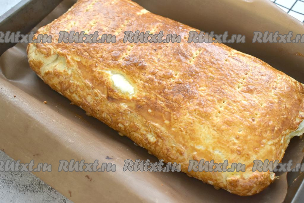 Отправляем пирог с творогом в разогретую до 180 градусов духовку примерно на 25 минут (до подрумянивания слоёного дрожжевого теста).