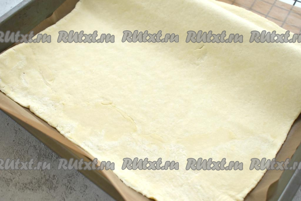 Размороженное тесто на слегка присыпанной мукой поверхности раскатываем в пласт толщиной примерно 2 миллиметра, перекладываем его на противень, заранее застеленный ковриком (или пергаментом) для выпечки.