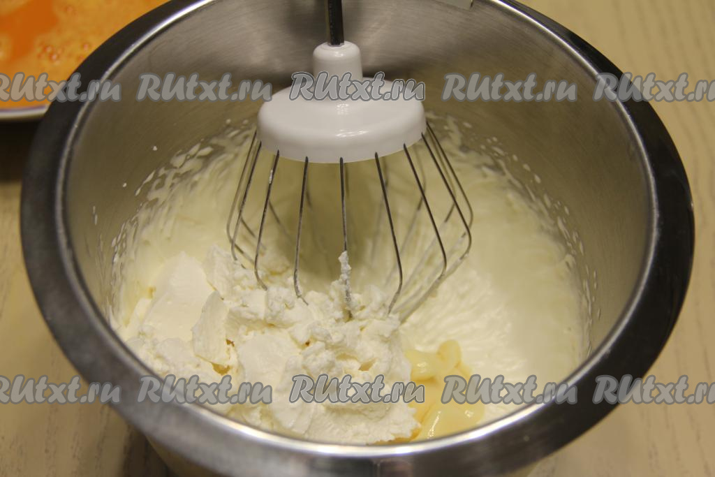 Во взбитые сливки добавить маскарпоне и сгущёнку, взбить миксером до стойких пиков.