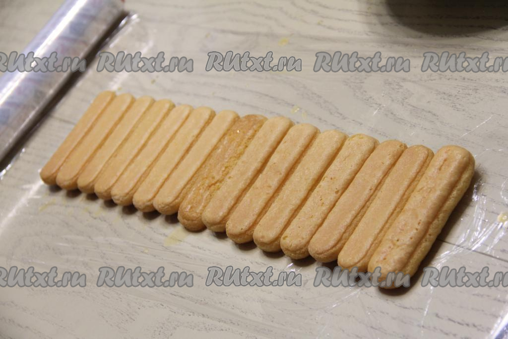 На столе расстелить пищевую плёнку (или прозрачный полиэтиленовый пакет). Выложить савоярди, пропитанное мандариновым соком, в один ряд вплотную друг к другу на пищевую плёнку. Я выложила 15 штук. Можно конечно выложить все 25 печенюшек, но я решила сэкономить плёнку.