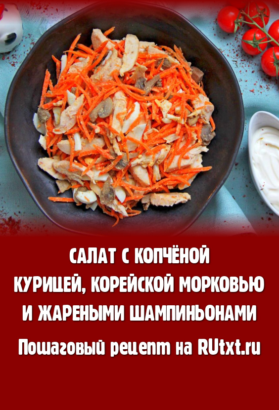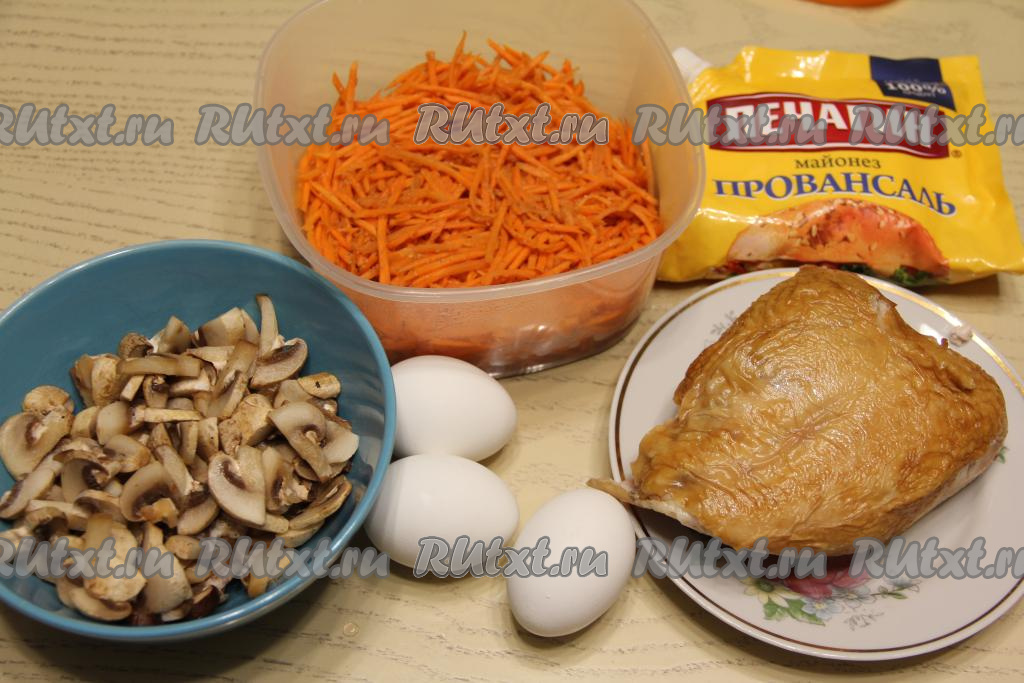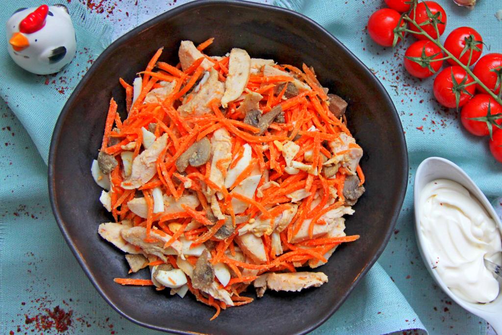 Аппетитный, очень вкусный, пикантный салат, приготовленный с копчёной курицей, корейской морковью и жареными шампиньонами, подать к столу.
