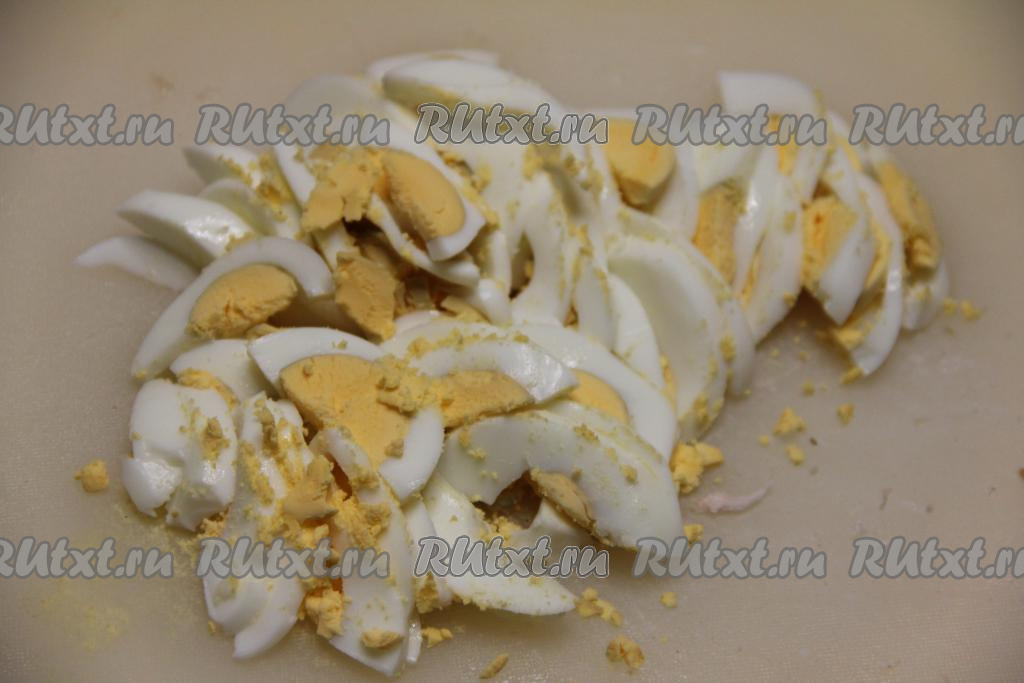 Подготовить продукты. Морковь по-корейски можно купить в магазине или приготовить самостоятельно. Свежие шампиньоны промыть водой, затем нарезать на пластинки. Я взяла замороженные, уже нарезанные шампиньоны. Яйца отварить в течение 10 минут после начала кипения воды, затем их нужно остудить и очистить.