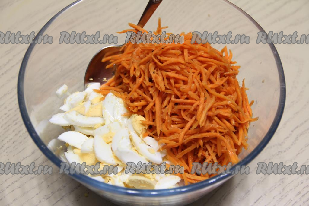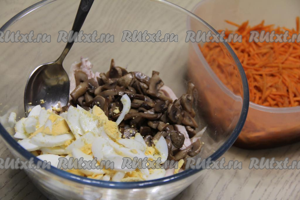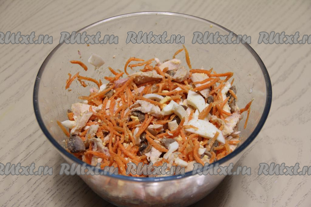 Если полоски корейской морковки длинные, тогда разрежьте их на части. Морковь тоже добавить в салатник с жареными шампиньонами, копчёной курицей и яйцами.