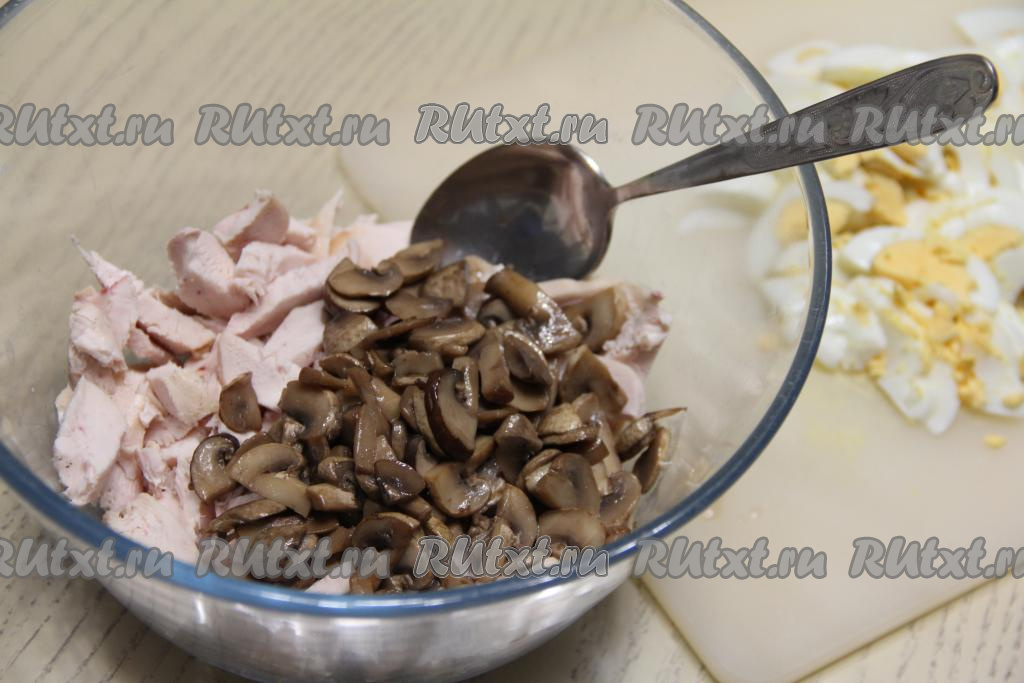 В салатнике соединить копчёную курицу и жареные шампиньоны.