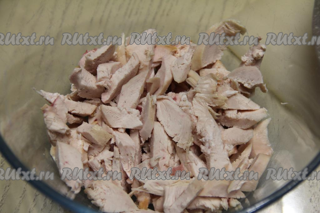 Грибочки снять с огня и остудить. Копчёное куриное мясо нарезать на достаточно крупные брусочки (или порвать на волокна).
