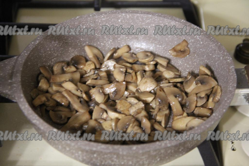В сковороде разогреть растительное масло, затем выложить шампиньона и обжарить грибы на среднем огне в течение 15-20 минут, иногда помешивая.