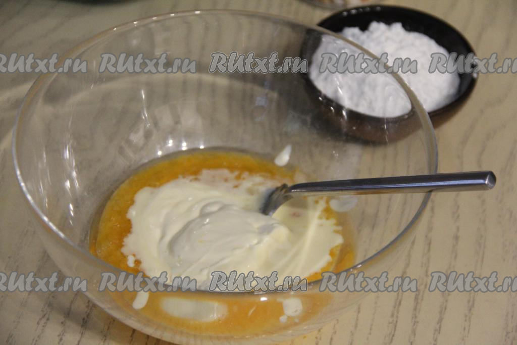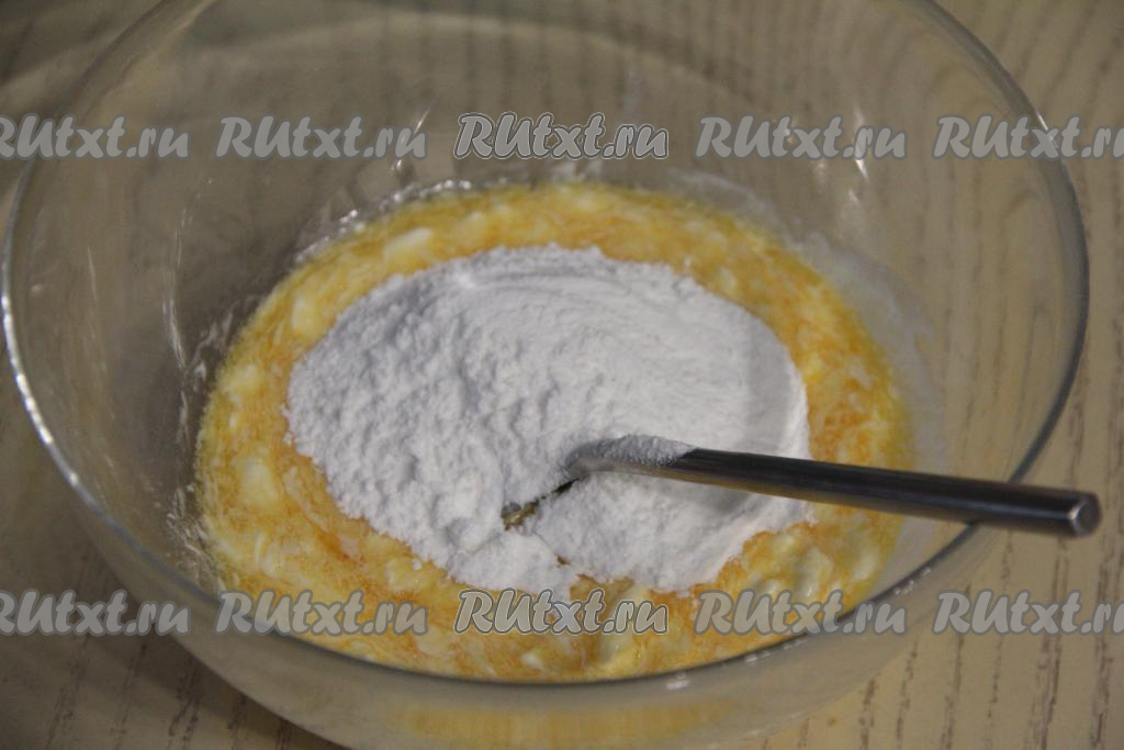 Всыпать половину муки, добавить разрыхлитель, перемешать вилкой.