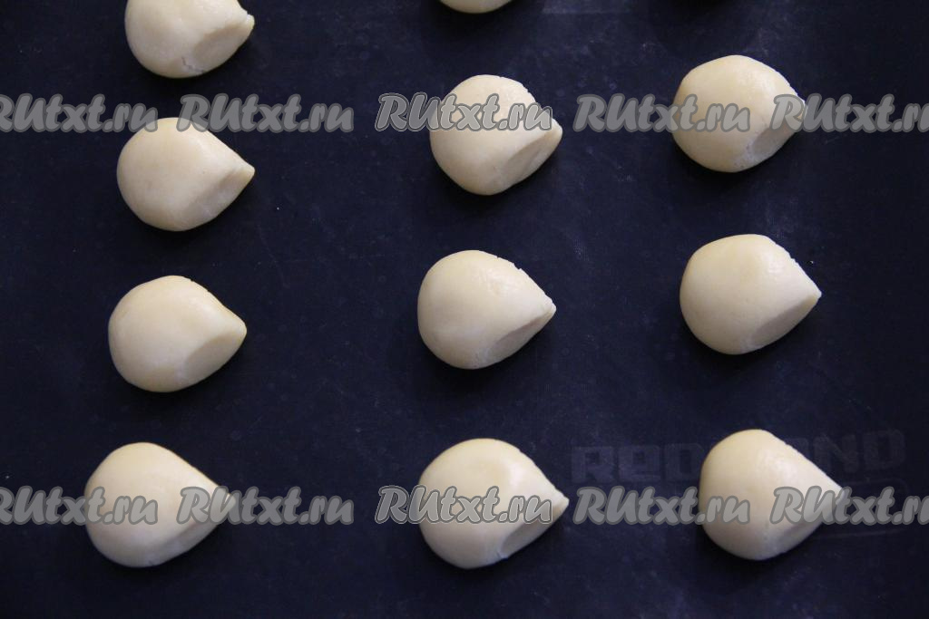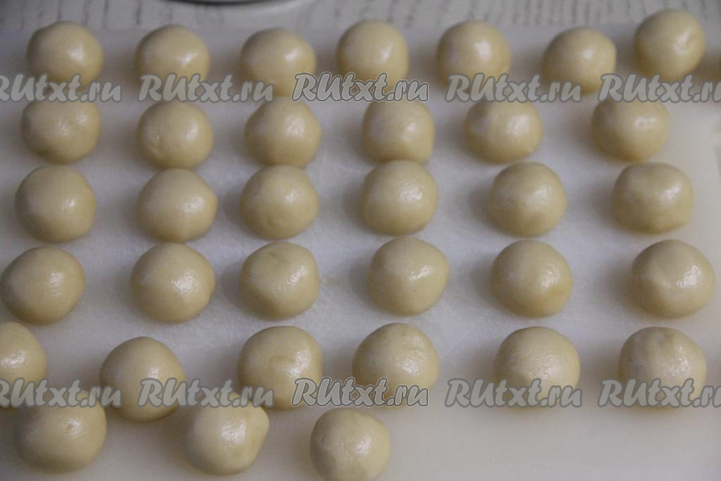 Разделить тесто на маленькие части, а затем каждую часть теста скатать в шарик. У меня получились 34 шарика.