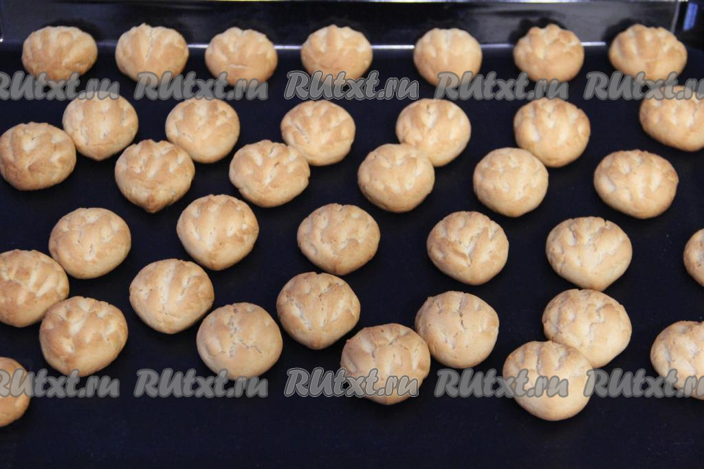 Выпекать орешки в разогретой духовке минут 15 (до золотистого цвета) при температуре 180 градусов. Готовые орешки достать из духовки и остудить.