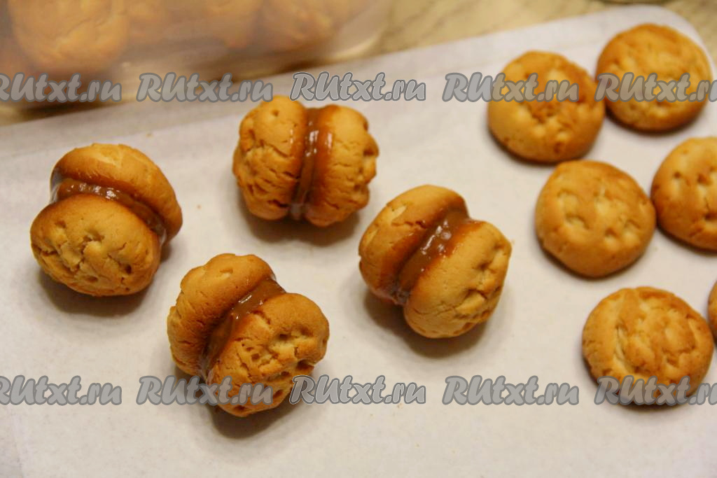 На одну половинку орешка выложить чайную ложку варёной сгущёнки.