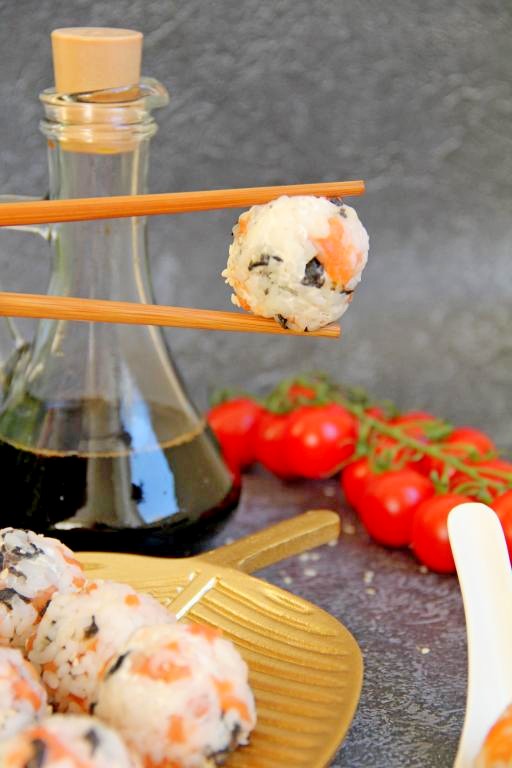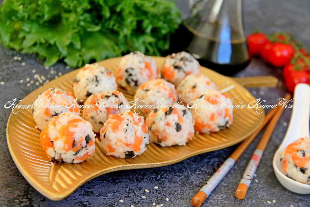 Очень вкусные, аппетитные ленивые суши-шарики с красной рыбой подать к столу с соевым соусом.