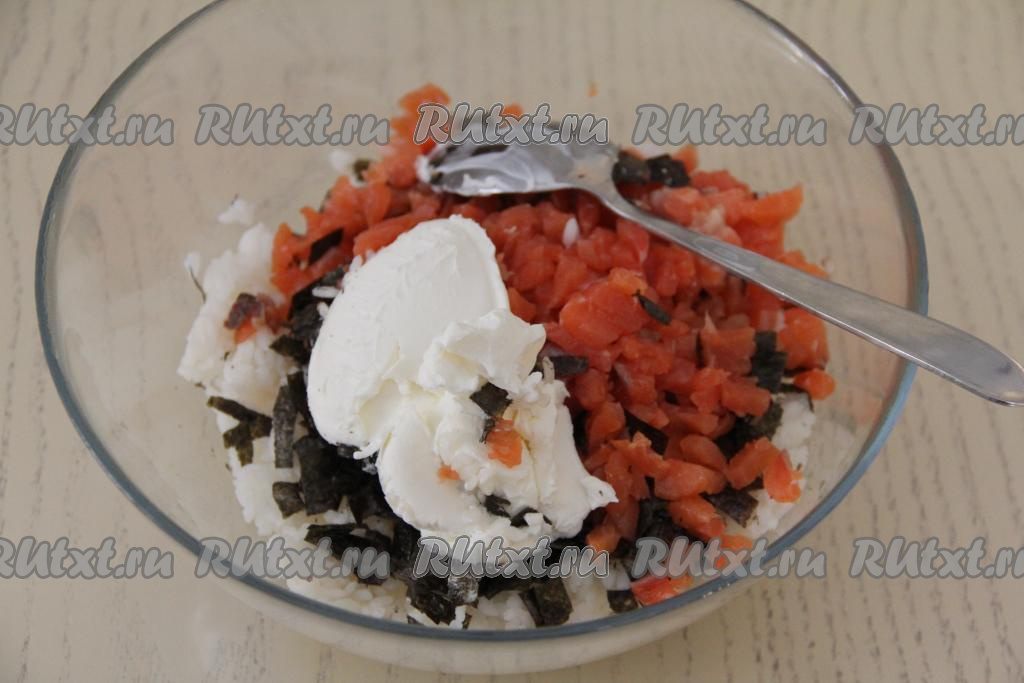 В миску с рисом и нори добавить красную рыбу и творожный сыр.