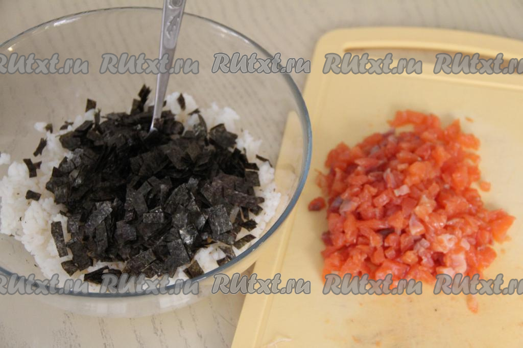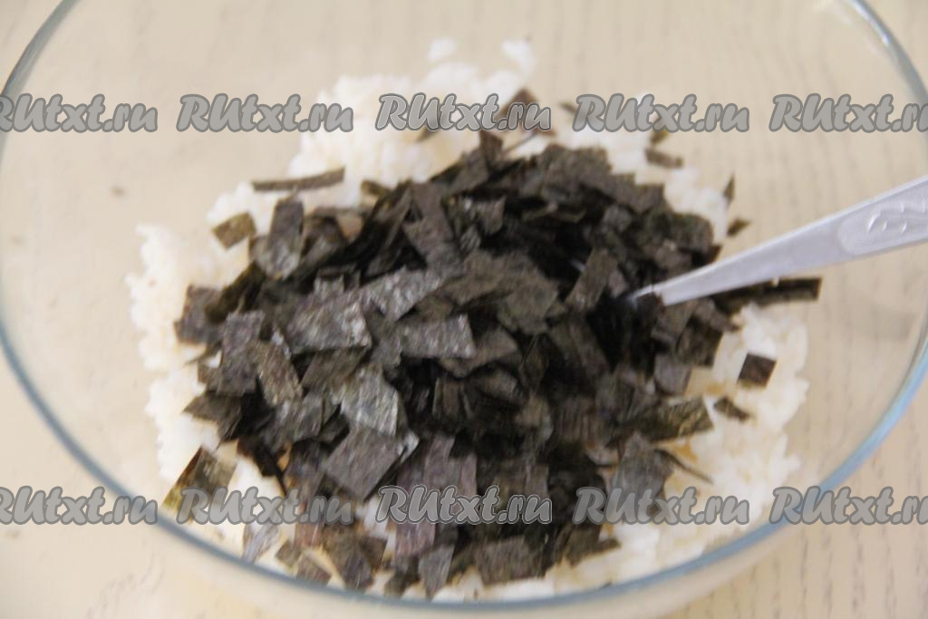 Листы нори нарезать ножницами на мелкие кусочки. В глубокой миске соединить остывший рис и нарезанные листы нори.