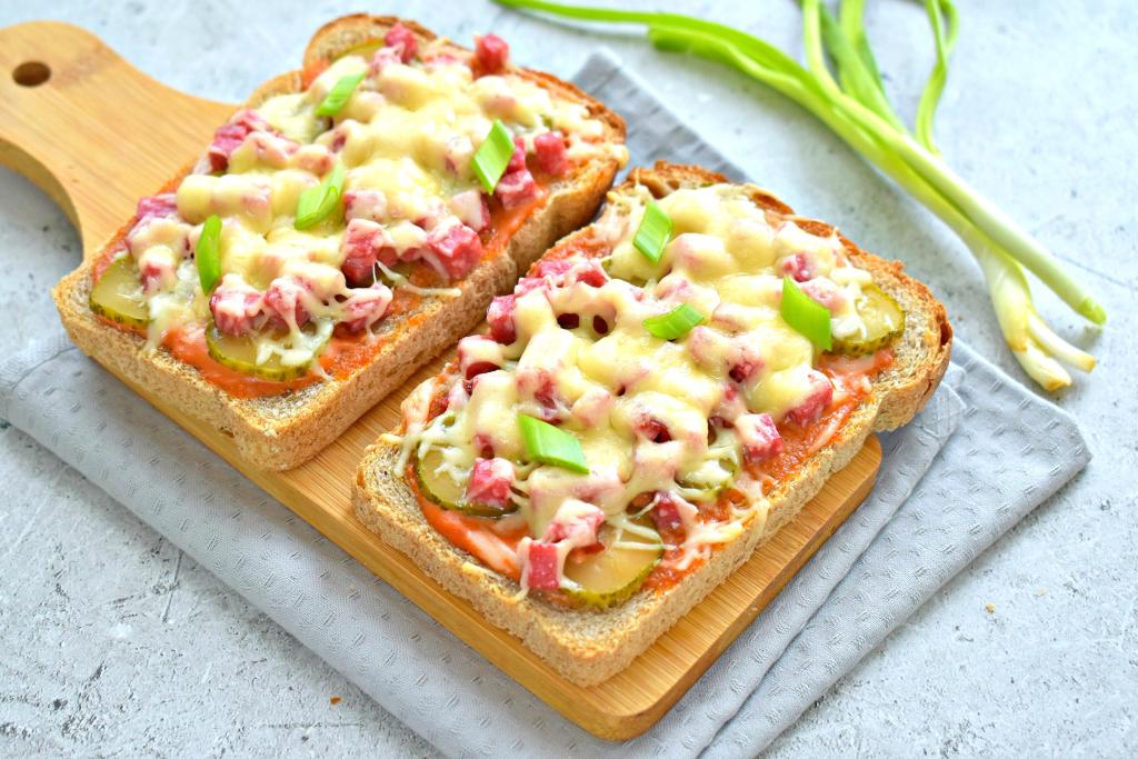 Предлагаю на завтрак или в качестве перекуса подать к столу очень вкусные горячие бутерброды "Мини-пицца", приготовленные в духовке. В этом блюде подрумяненый хлеб отлично сочетается с насыщенным соусом, сочным огурцом, аппетитной колбасой и ароматным сыром. Приготовление этих бутербродов не займёт много времени, а их вкус вас точно не разочарует!