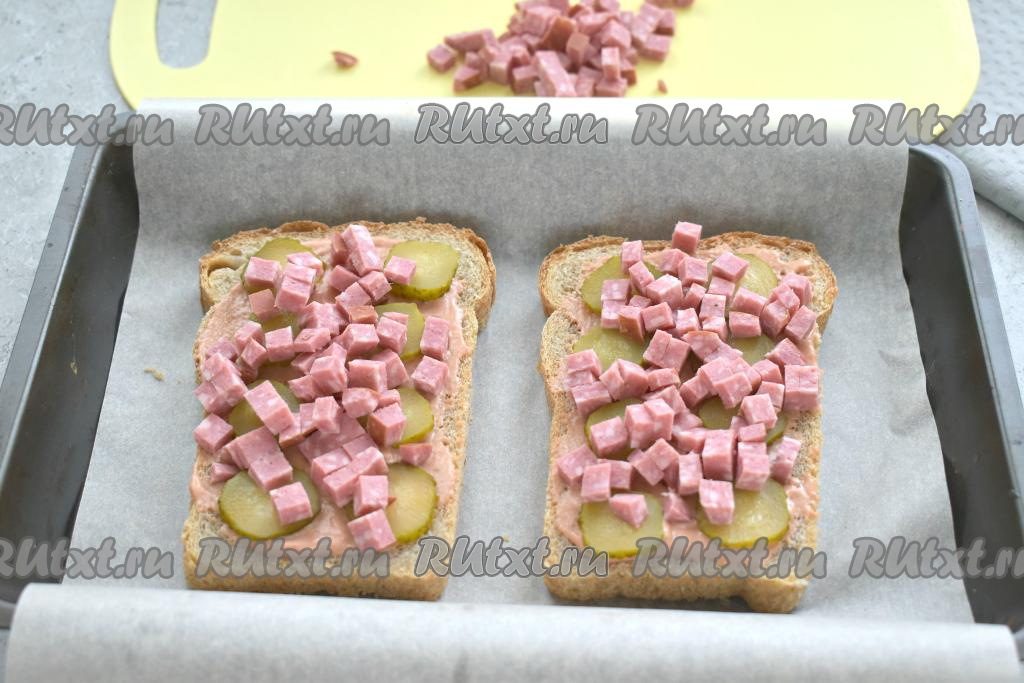 В форму для запекания, застеленную пергаментной бумагой, выкладываем ломтики хлеба (или батона), смазываем их получившейся томатно-майонезной смесью.