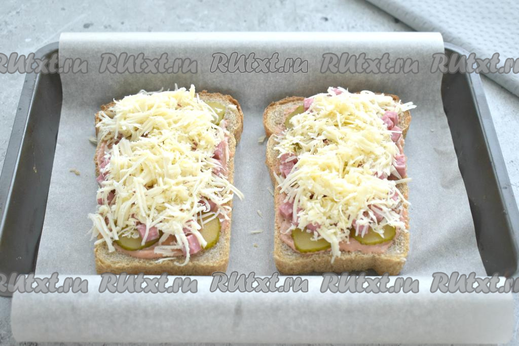 Сверху посыпаем бутерброды сыром, натёртым на средней тёрке.