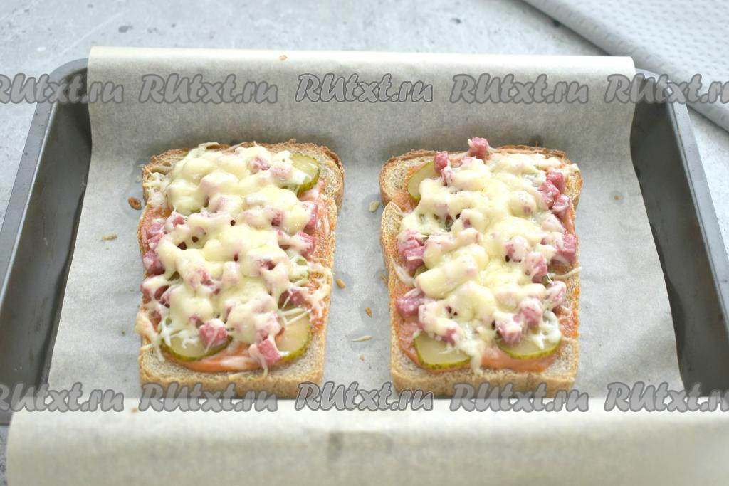 Отправляем бутерброды "Мини-пицца" в духовку, предварительно разогретую до 180 градусов, и запекаем минут 5-7 (сыр должен полностью расплавиться).