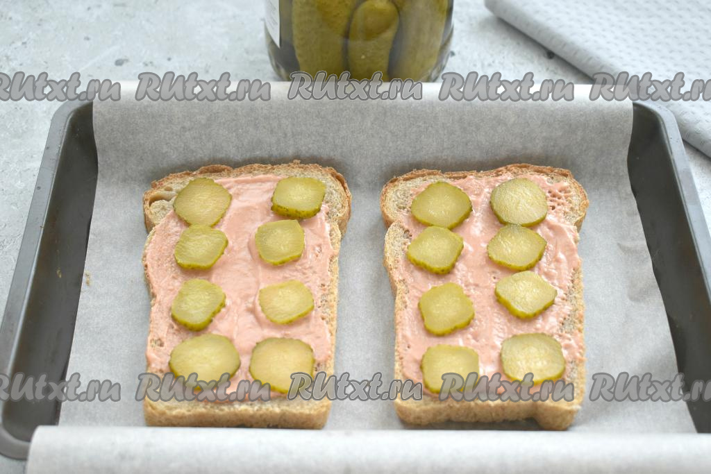 Солёный (или маринованный) огурчик нарезаем на тонкие кружочки и выкладываем на смазанные ломтики хлеба.