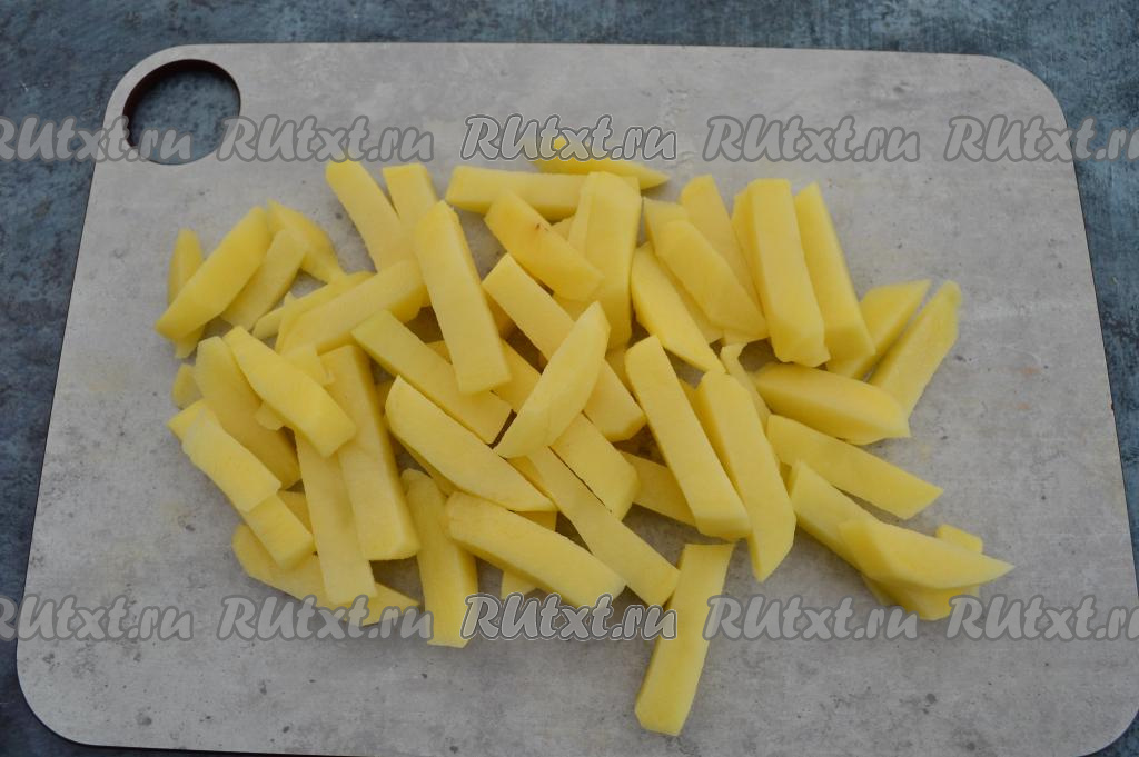 Очищенную картошку нарезать на брусочки среднего размера.