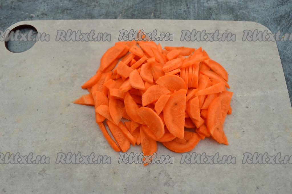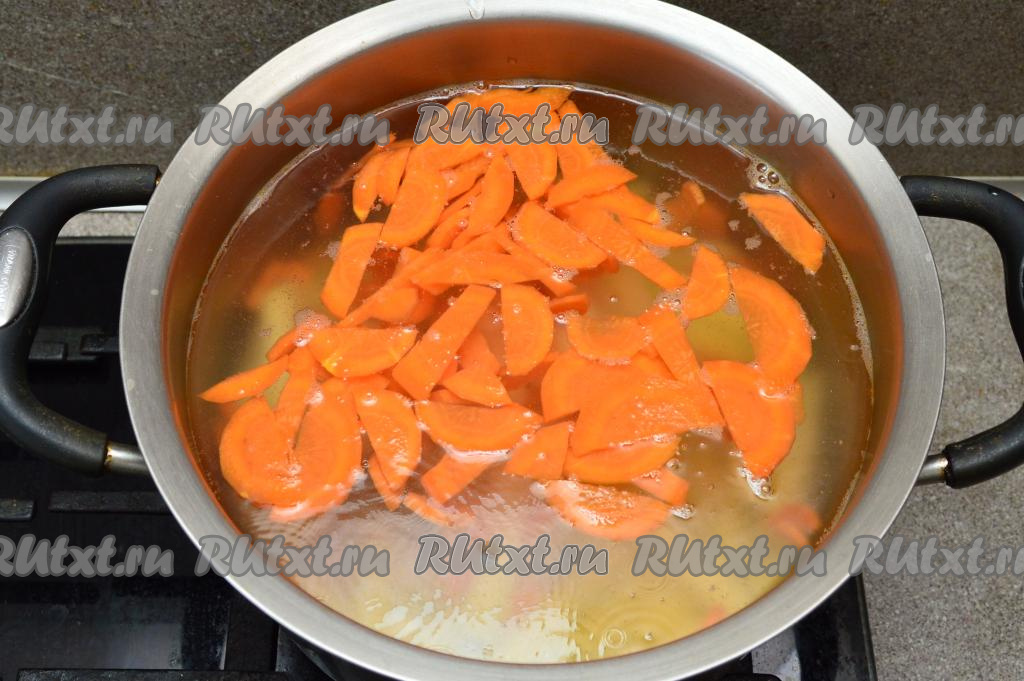 Пока закипает вода, очистить морковь, нарезать на тонкие полукружочки (или брусочки).