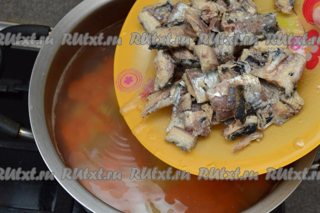 После того как овощи проварятся 15 минут, выложить в кастрюлю подготовленные кусочки иваси вместе с жидкостью из банки с консервами и лавровый лист, дать рыбному супу закипеть, уменьшить огонь, проварить 3 минуты. Затем суп посолить (добавляя соль, учитывайте, что консервы солёные), варить ещё 5 минут (картошка и морковь должны стать достаточно мягкими и легко прокалываться вилкой) и убрать с огня.