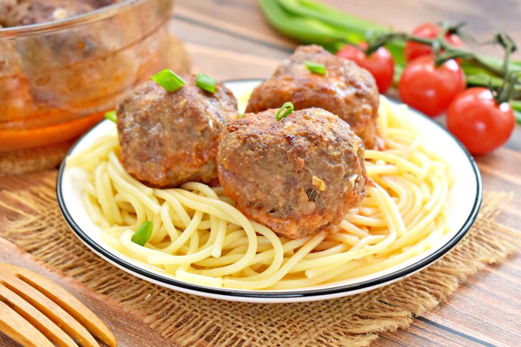 Тефтели, приготовленные без риса, получились сочными и вкусными, они хорошо держат форму. К столу я подала их со спагетти, поливая томатном соусом, в котором тефтели запекались в духовке.