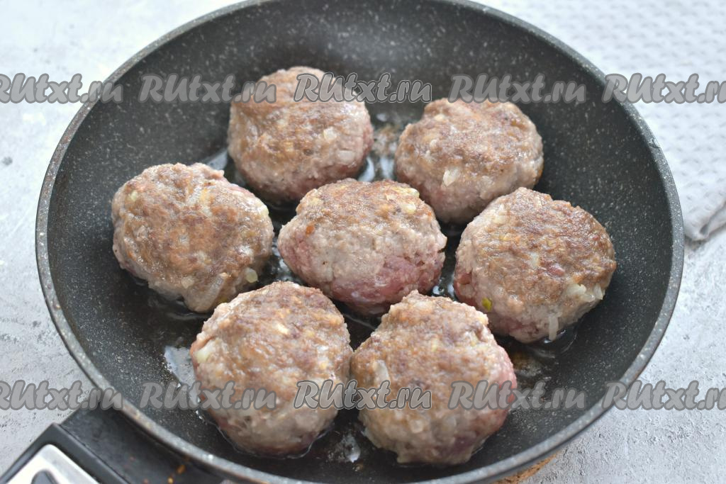 Разогреваем на сковороде растительное масло. Выкладываем в горячее масло заготовки тефтелей и обжариваем их на среднем огне до подрумянивания с двух сторон (примерно по 2 минуты с каждой стороны).