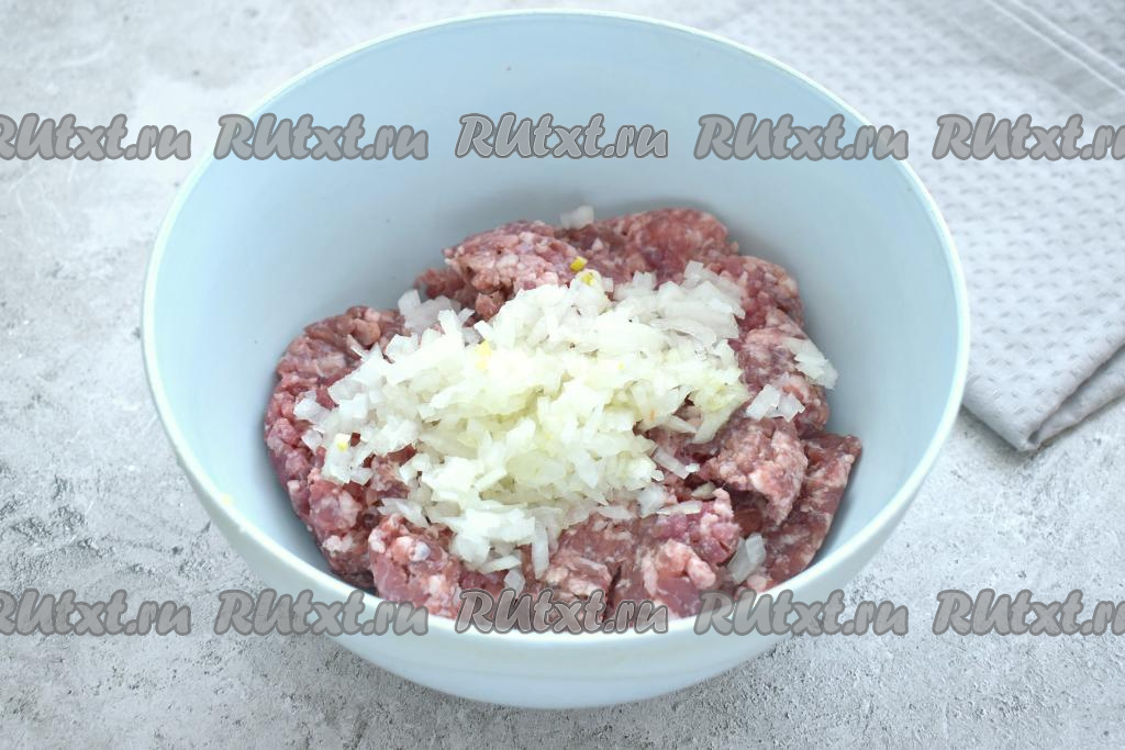 Перекладываем фарш в объёмную миску, добавляем очищенную и мелко нарезанную луковицу.