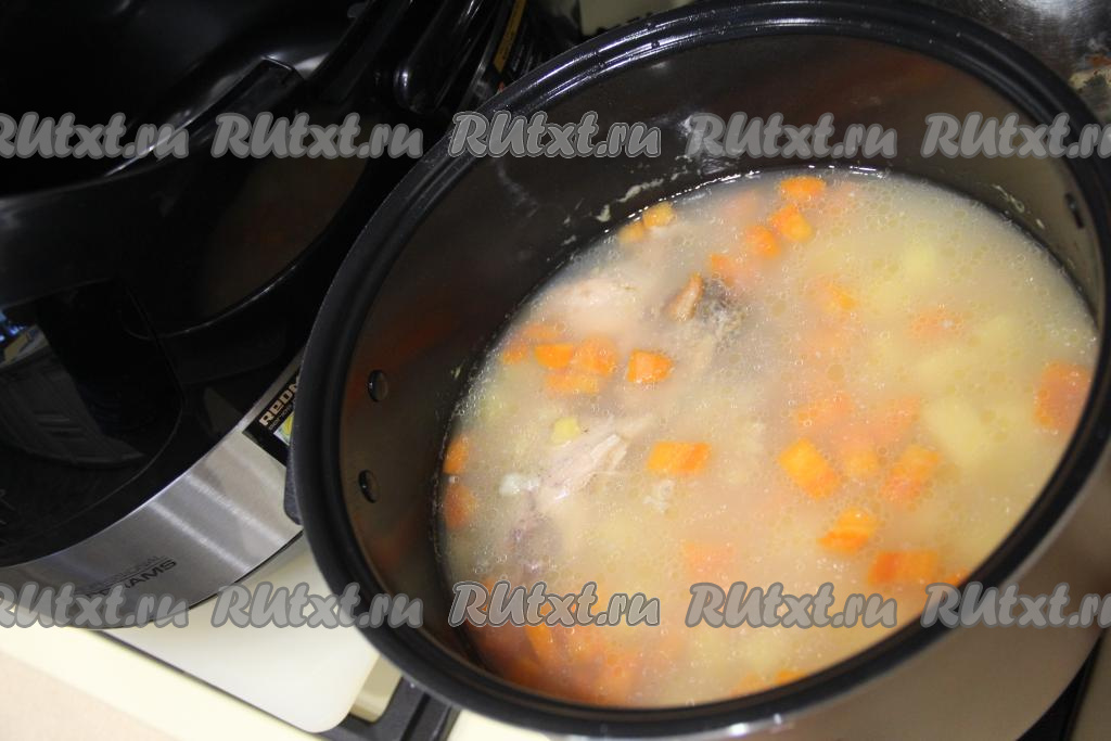 Картошку нарезать на кубики. Нарезанные морковку и картошку тоже добавить в чашу мультиварки.