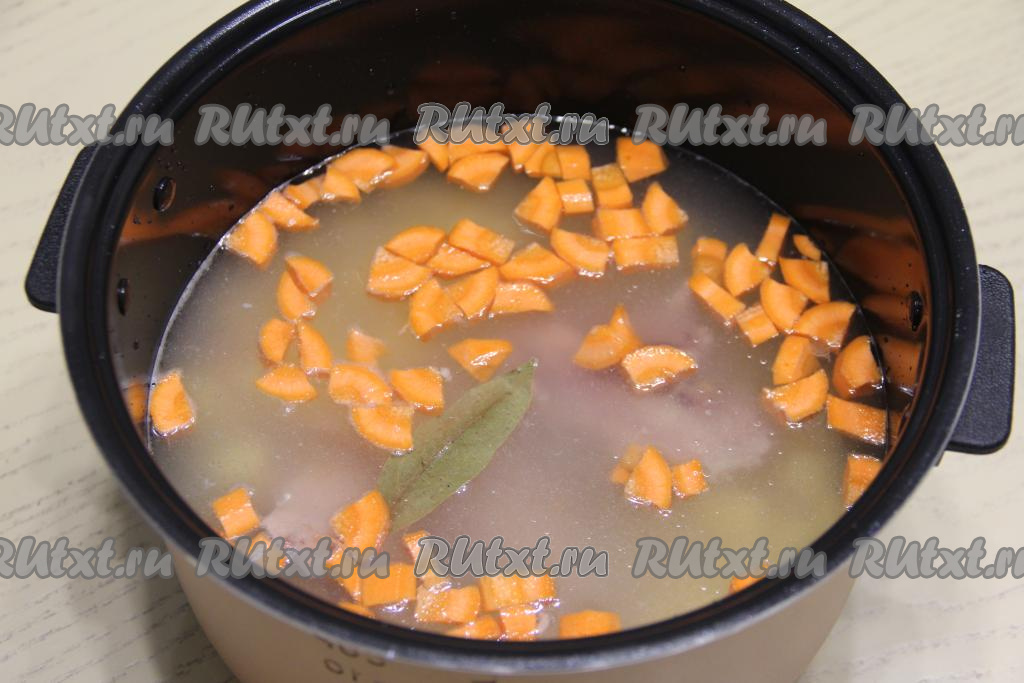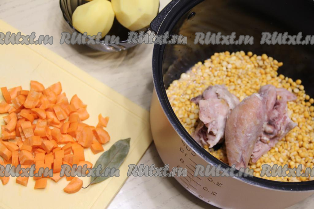 Горох промыть водой, затем вместе с копчёным мясом поместить в чашу мультиварки. Морковь нарезать на кубики.