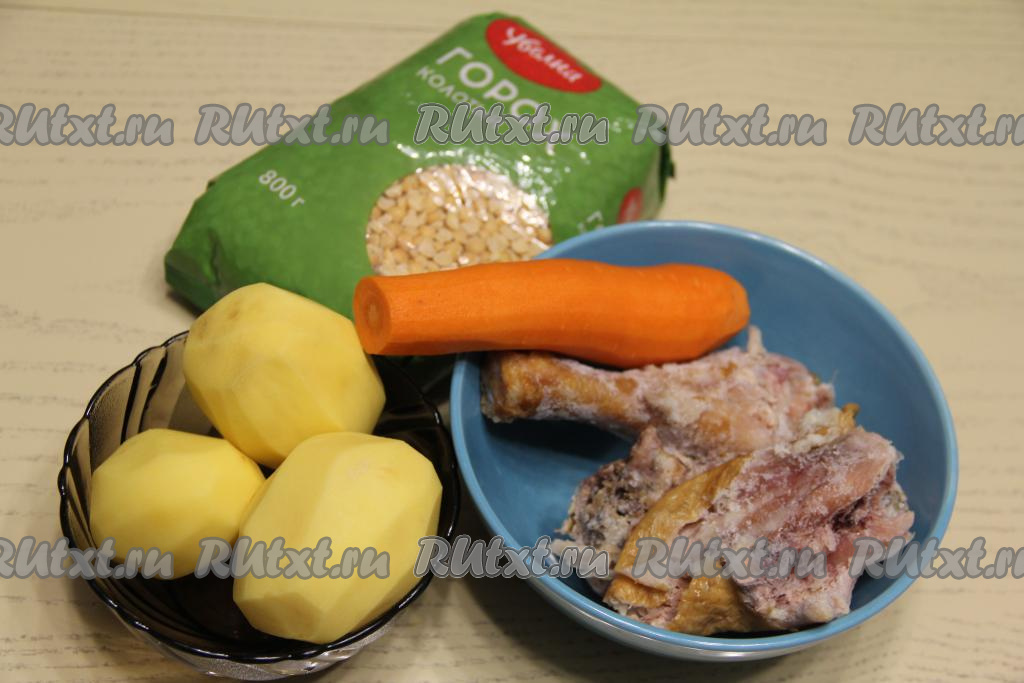 Подготовить продукты. Картошку и морковь почистить. В этот раз я готовила гороховый суп-пюре с замороженными кусочками копчёной курицы.