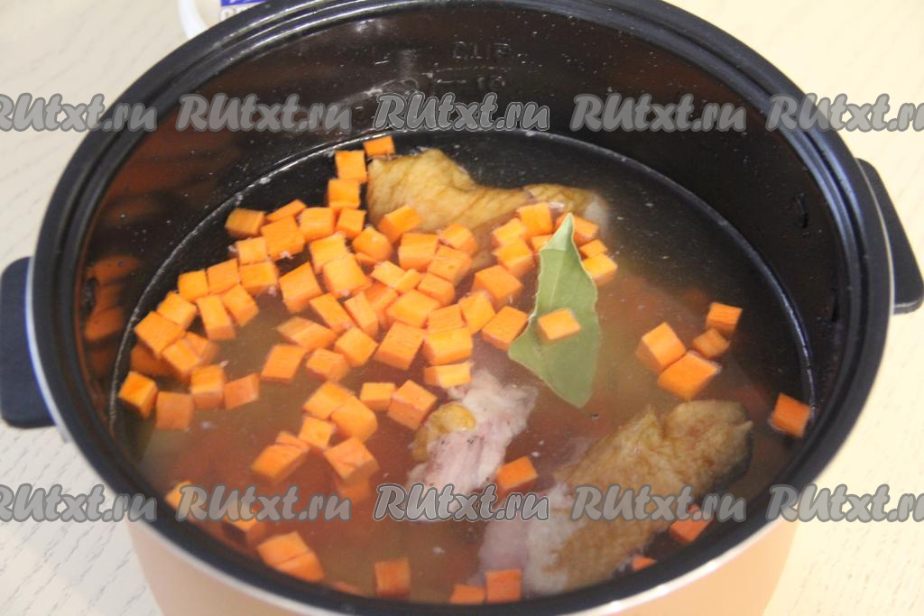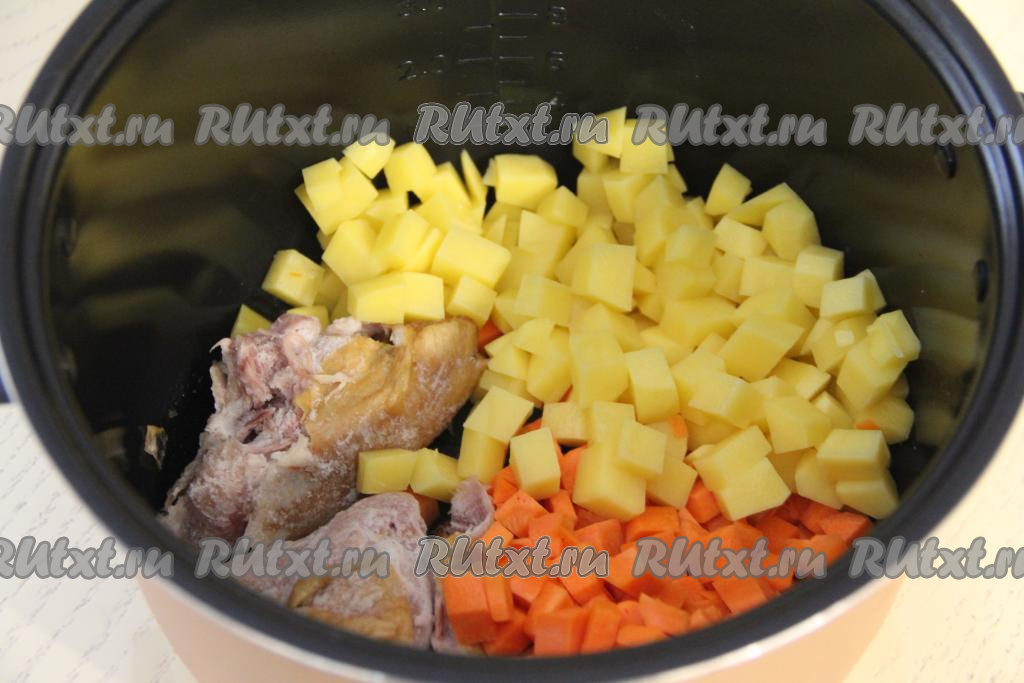 Если вы готовите с копчёными свиными рёбрышками, тогда, по желанию, их можно порубить на части. Кусочки копчёной курицы тоже можно нарезать на небольшие части. Морковь, нарезанную на средние кубики, и копчёности выложить в чашу мультиварки.