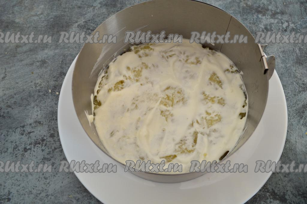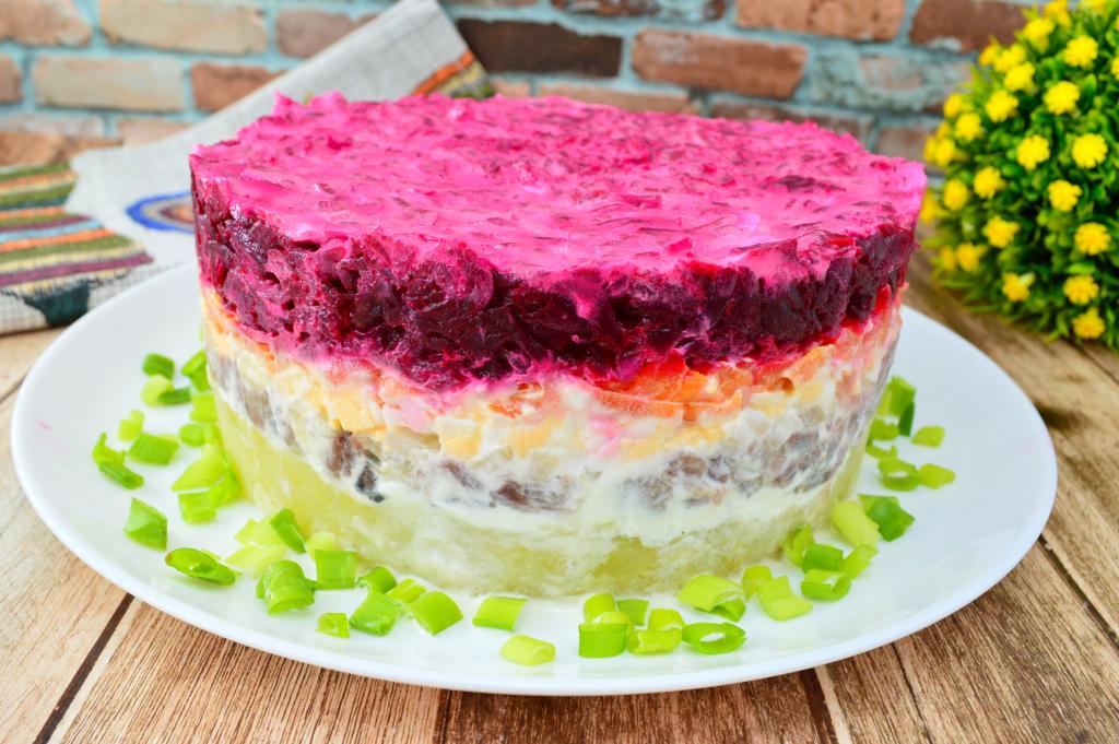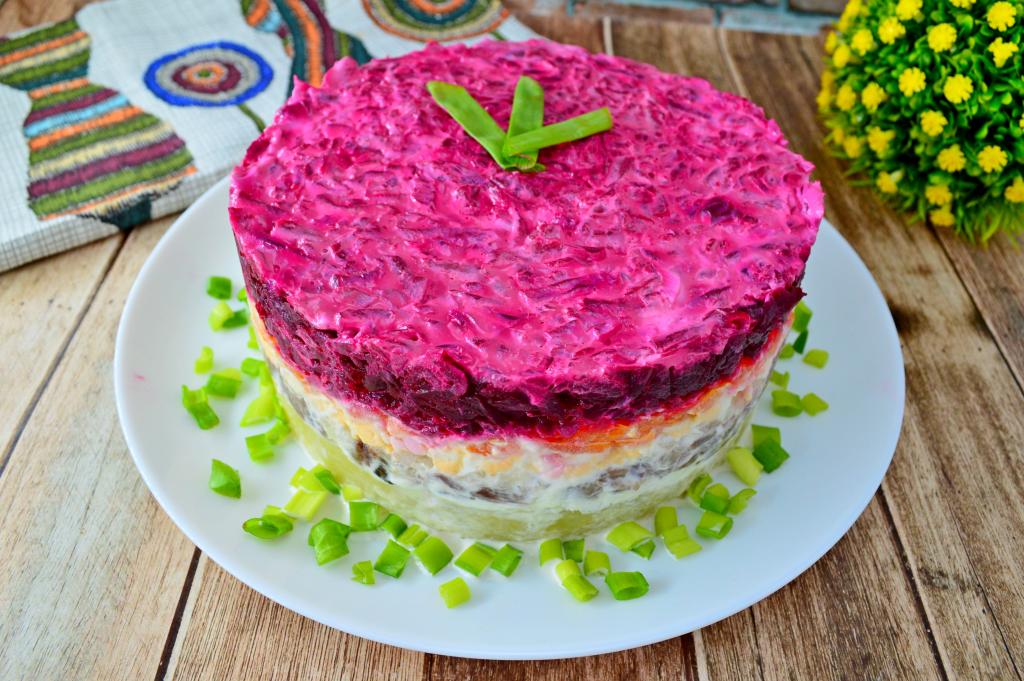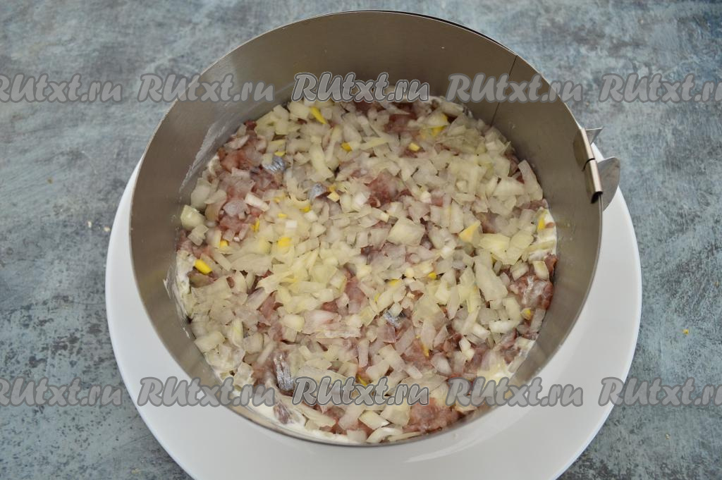 Я использовала кольцо диаметром 16 сантиметров, салат получился высоким, можно сделать его более плоским, для этого нужно взять кольцо диаметром 20 сантиметров.