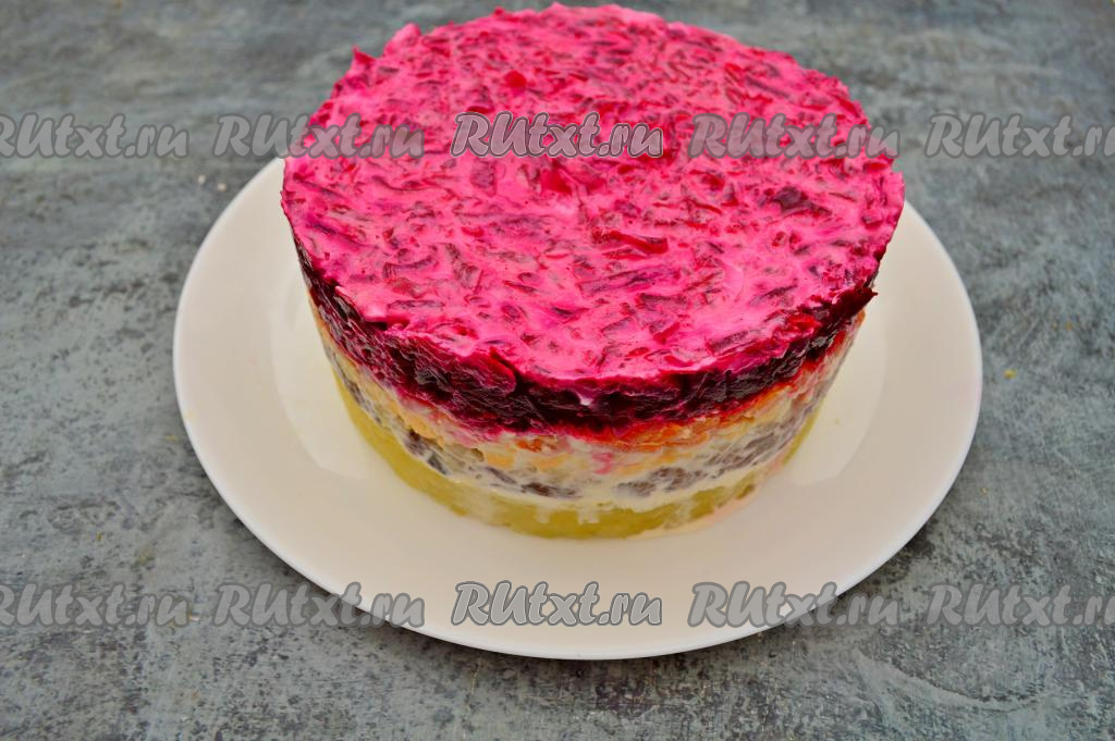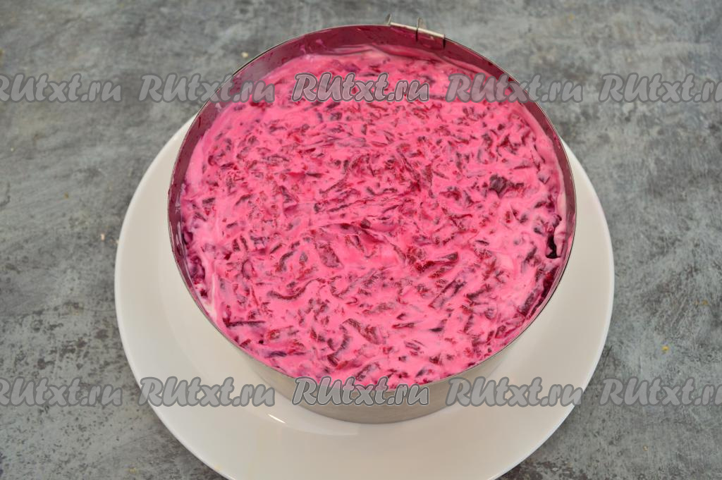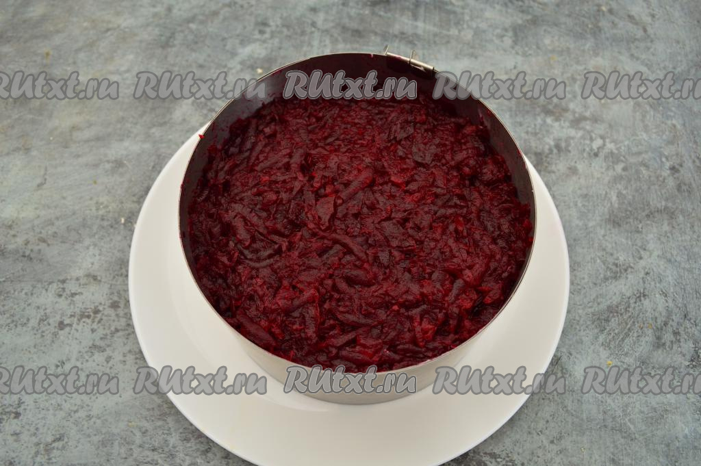 Завершающим слоем салата будет очищенная свекла, натёртая на крупной тёрке, немного утрамбовать.